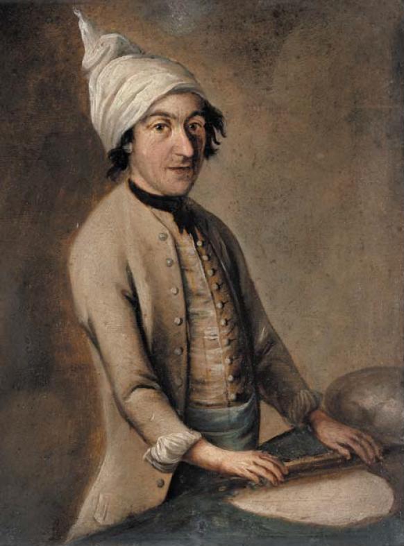 Die erste Tafel des Büchel-Weges befindet sich bei der Einmündung der Emanuel Büchel-Strasse in die Hauptstrasse. Sie zeigt ein Selbstportrait des Künstlers. Wenn Sie vom Schloss, vom Tram oder vom Bahnhof kommen, können Sie auch bei Tafel 2 beginnen und das Portrait Büchels nach Tafel 4 studieren.