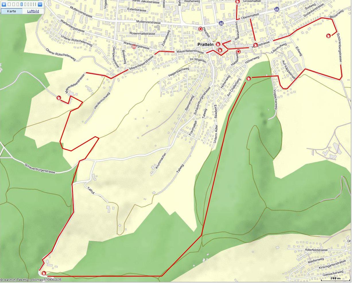 Rückweg ins Dorfzentrum von Pratteln. Von da erreichen Sie über die Mayenfelserstrasse in ca. 20 Min. wieder das Dorfzentrum.