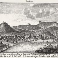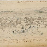 Die erste Tafel des Büchel-Weges befindet sich bei der Einmündung der Emanuel Büchel-Strasse in die Hauptstrasse. Sie zeigt ein Selbstportrait des Künstlers. Wenn Sie vom Schloss, vom Tram oder vom Bahnhof kommen, können Sie auch bei Tafel 2 beginnen und das Portrait Büchels nach Tafel 4 studieren.